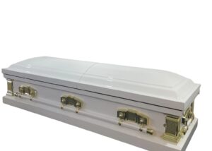 This elegant casket is white, with white and gold coloured handles. It comes with a split lid. The size is suitable for people of upto 120kg. The casket is the personification of superior craftsmanship and refined styling where premium materials are used to create an exceptional finish. Lined with a soft side-set and a matching mattress and 1 superior pillow, this casket is the top of the range. Elegantly rounded off with white swinging long-bars. The insert can be changed, the Last Supper insert is pictured. Praying hands or a Plain Insert is also available.
